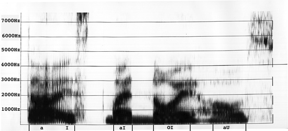 zeigt die gleitenden Formantübergänge (Transitionen) der Diphthonge. Zu